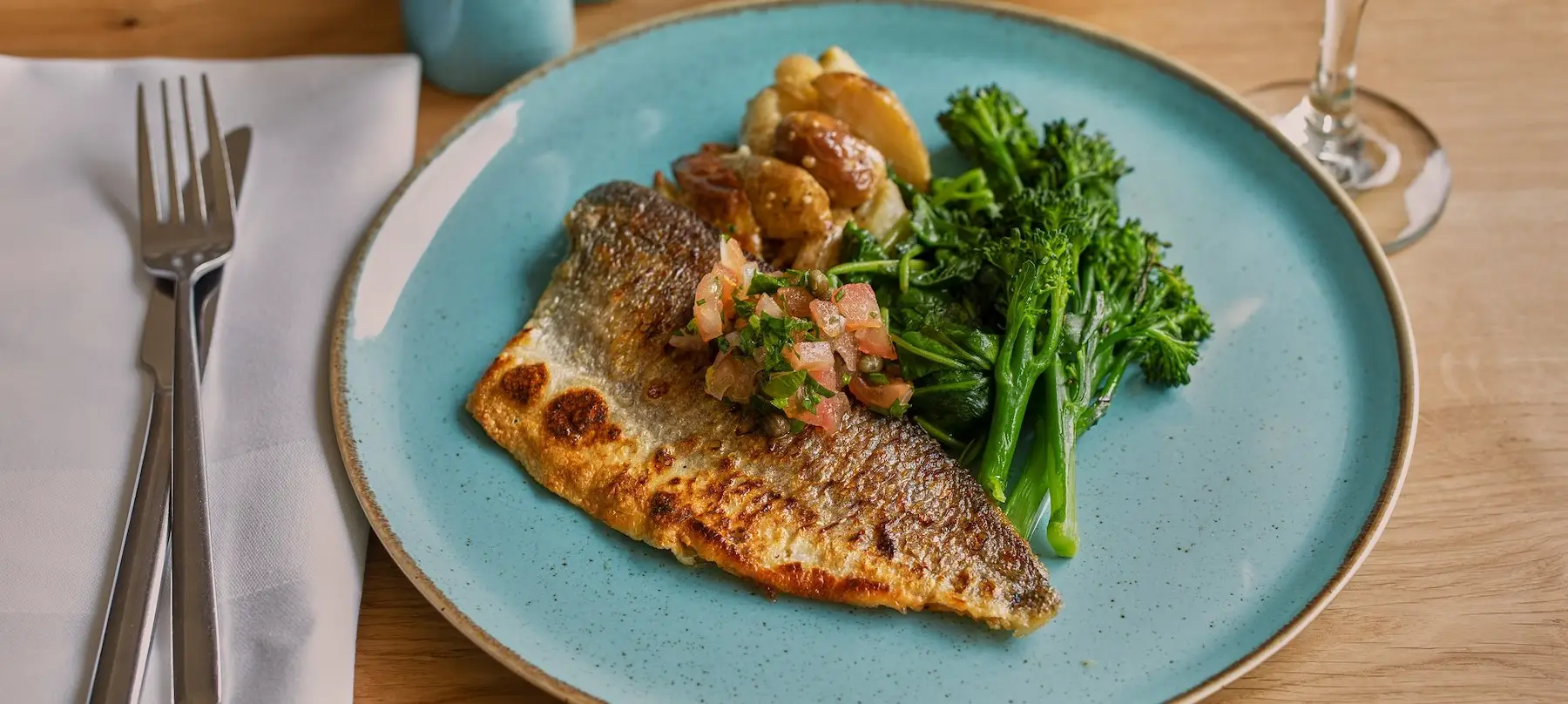 • Roasted Stone Bass (GF) 406 kcal, Sweet Potato & Chilli Mash, Cabbage & Salsa Verde (Contains: F, SU)